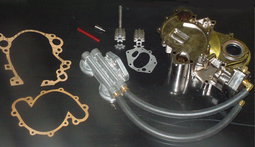 This is a collaboration of the best we make and offer in our shop. The kit includes a Ni plated oil pump/timing cover, A set of our HRC oil pump gears, A Ni plated #626 oil filter relocation plate, A Derale dual filter remote mount, Fittings for the plumbing, A new polished plunger and a new pressure spring and the gaskets for the Timing cover to block and the timing cover to water pump!